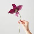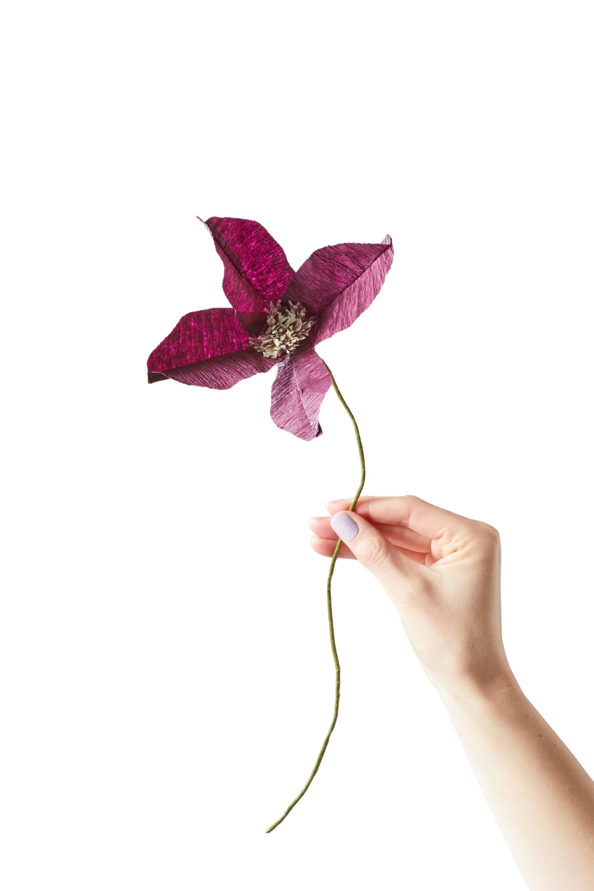 Denne blomst er lavet af gennemfarvet aubergine crepepapir og monteret på en lang, bøjelig grøn stilk. Stilken kan du let forme, så du kan få den form og længde du ønsker. Blomsten er inspireret af den storblomstrende clematis Jackmanii, der beriger de danske haver sidst på sommeren. Udover farven Aubergine fåes denne variant også i en lys lilla.