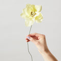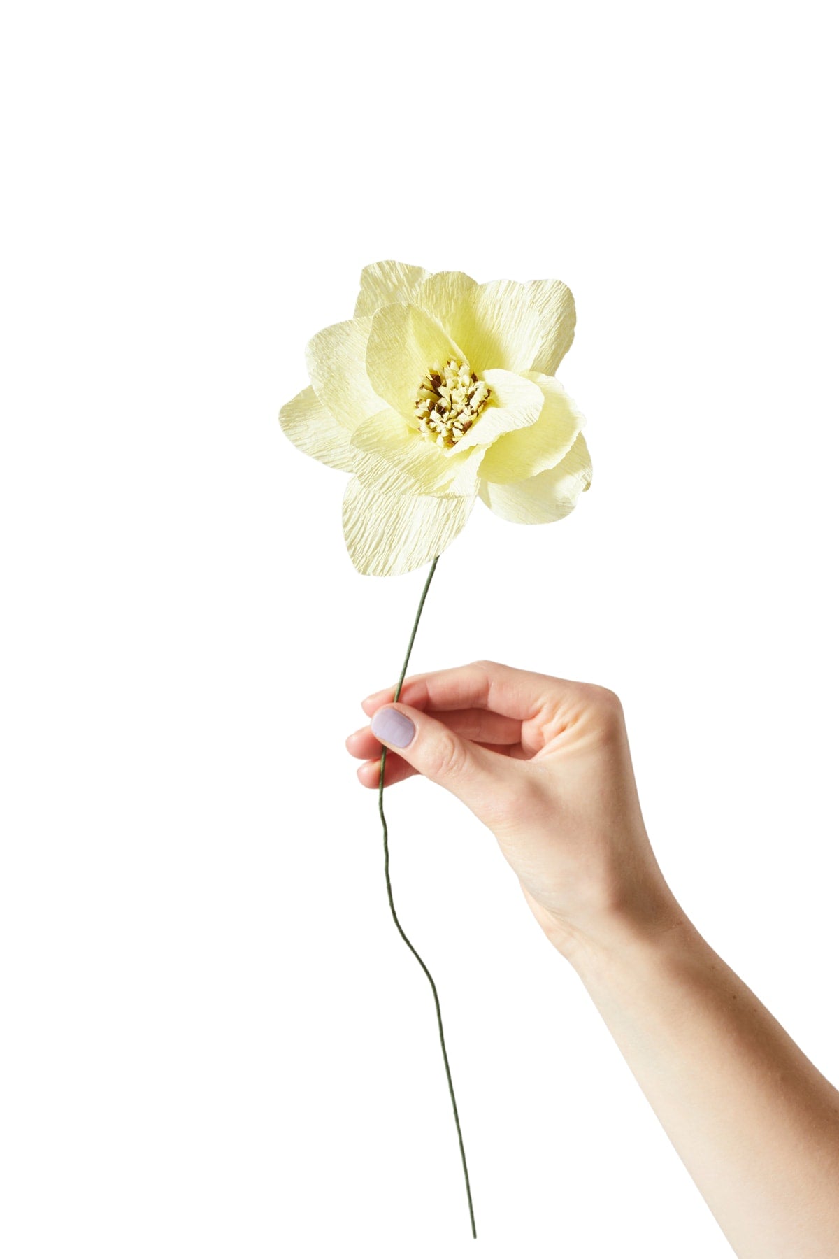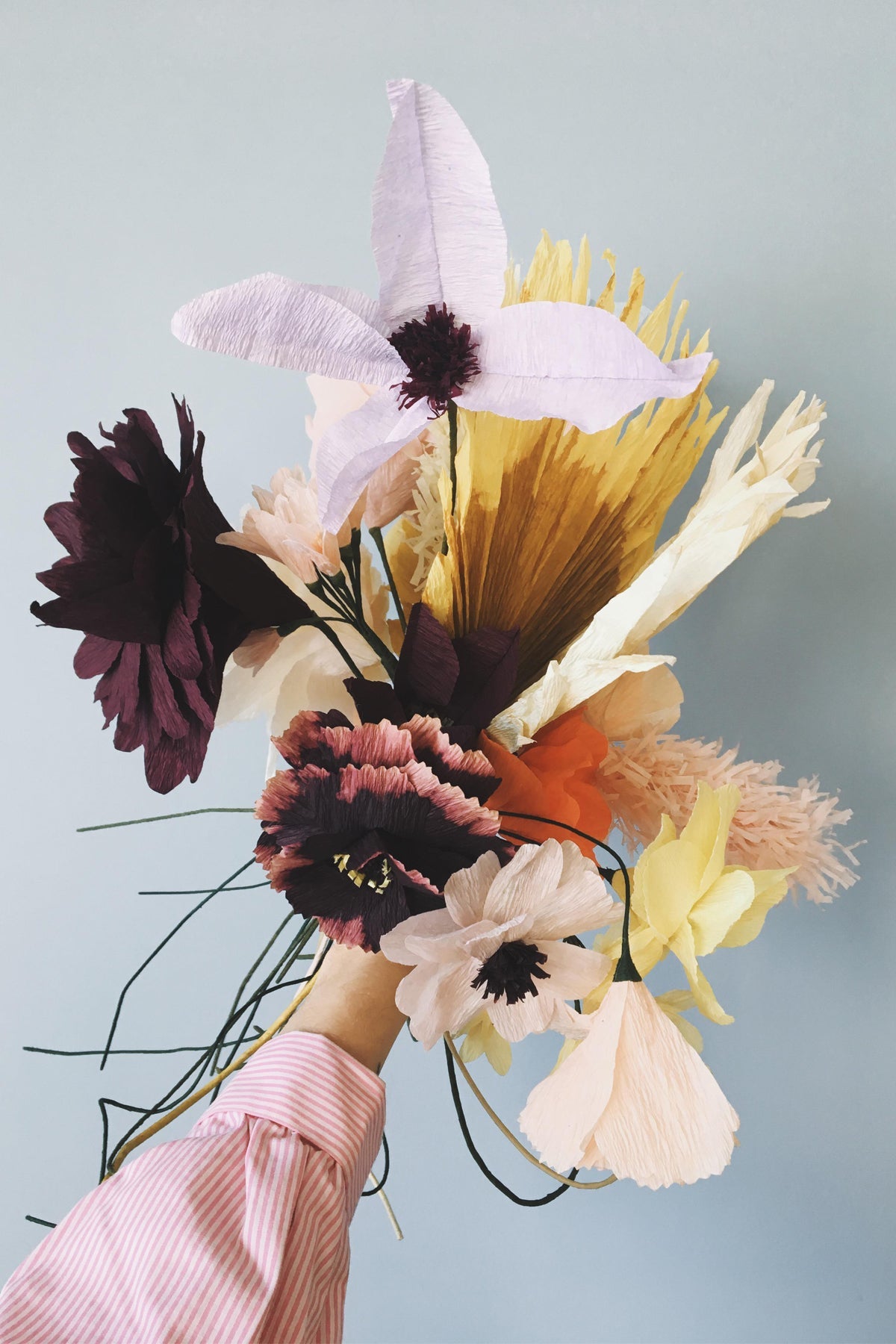 Papirblomsterne fra Studio About er håndlavede og nænsomt foldet sammen i små rør. Når du modtager din blomst, skal du selv folde bladene ud for at give den liv. Crepepapiret er let at forme, så du kan justere blomstens udseende og give den et personligt præg.
