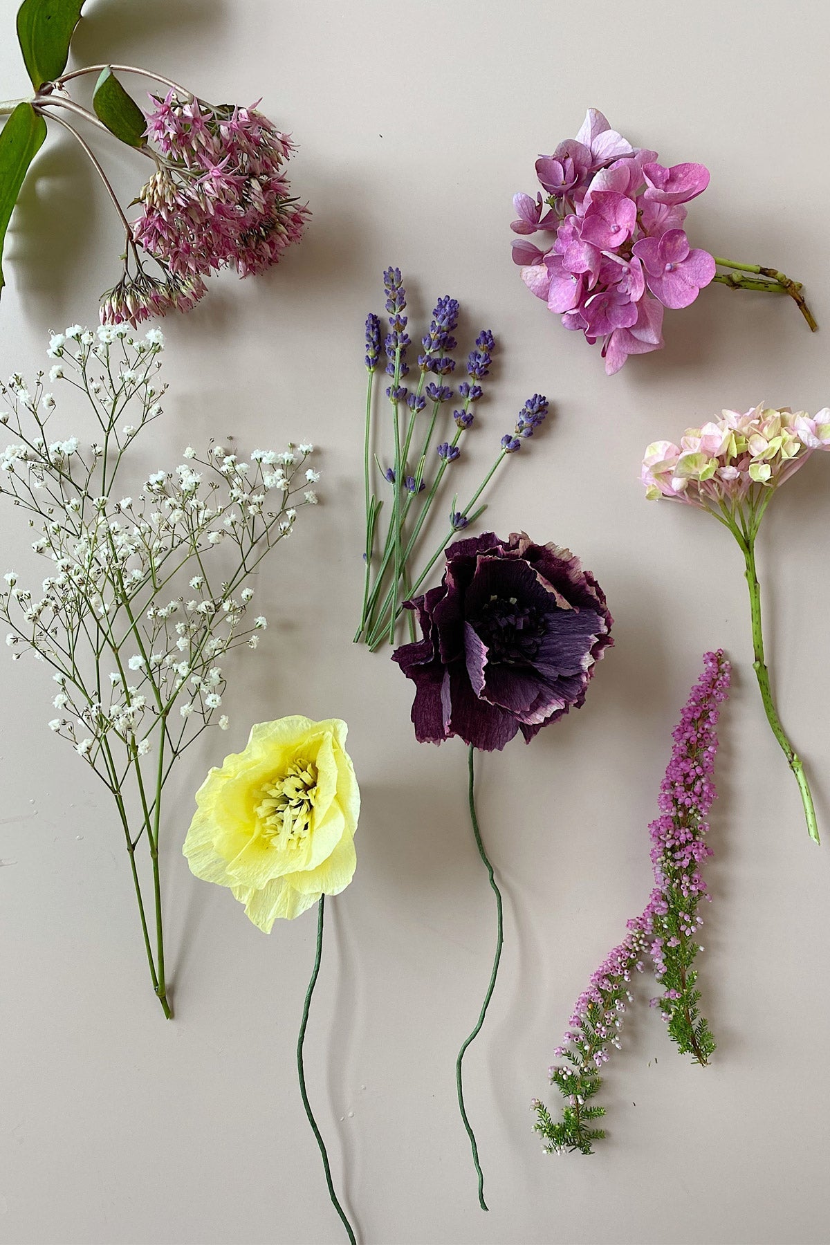 Du kan også kombinere dine papirblomster med tørrede blomster i alverdens farver, det vil give et stærkt udtryk og er super som værtindegave eller bare til pynt hjemme i en travl hverdag. Prøv eksempelvis at kombinere de smukke crepeblomster med nogle tørrede græsser.