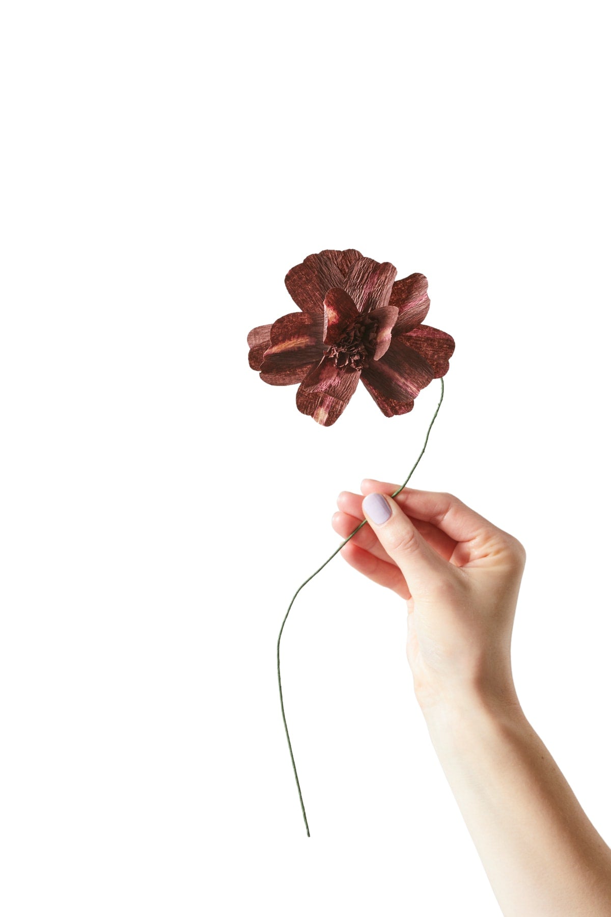 Papirblomsterne fra Studio About er håndlavede og nænsomt foldet sammen i små rør. Når du modtager din blomst, skal du selv folde bladene ud for at give den liv. Crepepapiret er let at forme, så du kan justere blomstens udseende og give den et personligt præg.