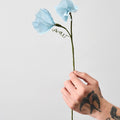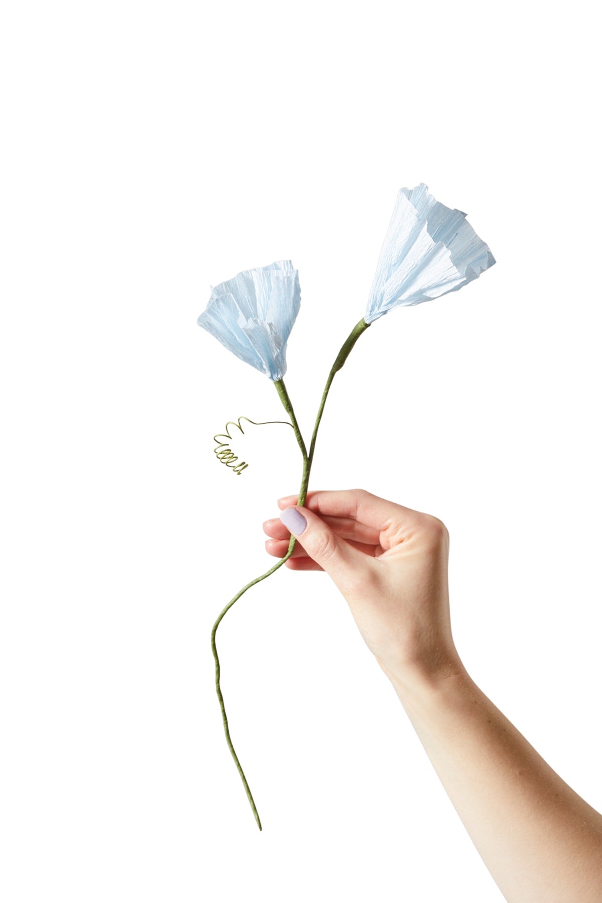 Denne blomst er lavet af gennemfarvet crepepapir og monteret på en lang, bøjelig grøn stilk. Stilken kan du let forme, så du kan få den form og længde du ønsker. Denne variant er i farven blå men fåes også i rosa.