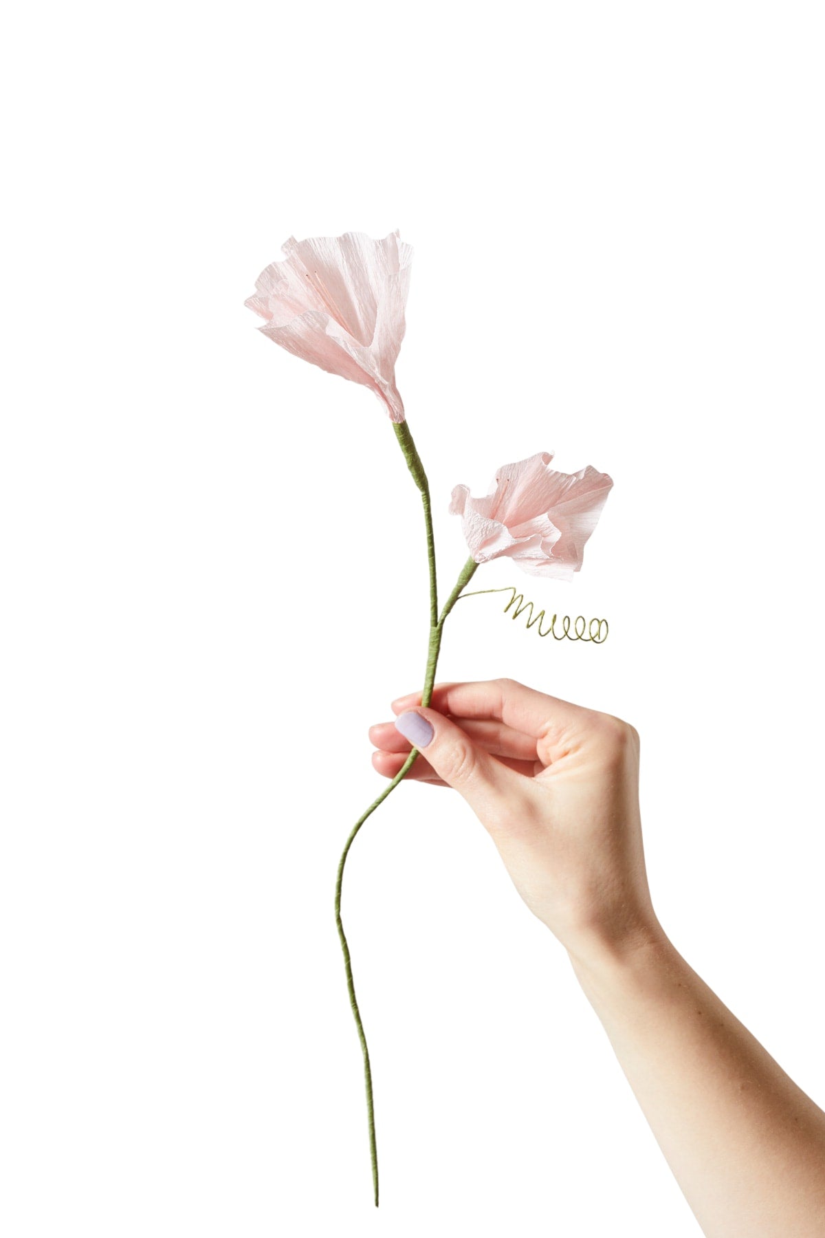 Papirblomsterne fra Studio About er håndlavede og nænsomt foldet sammen i små rør. Når du modtager din blomst, skal du selv folde bladene ud for at give den liv. Crepepapiret er let at forme, så du kan justere blomstens udseende og give den et personligt præg.