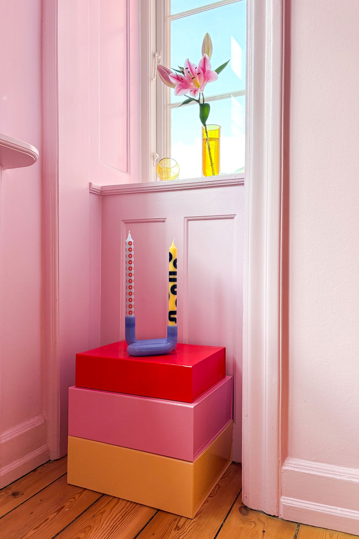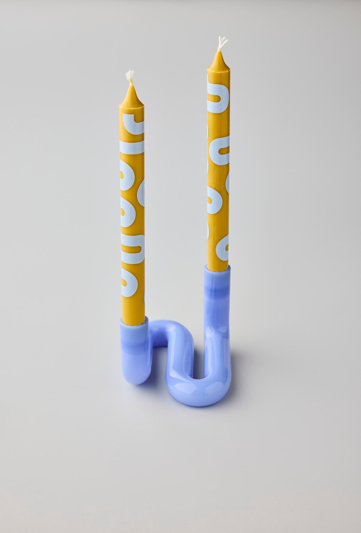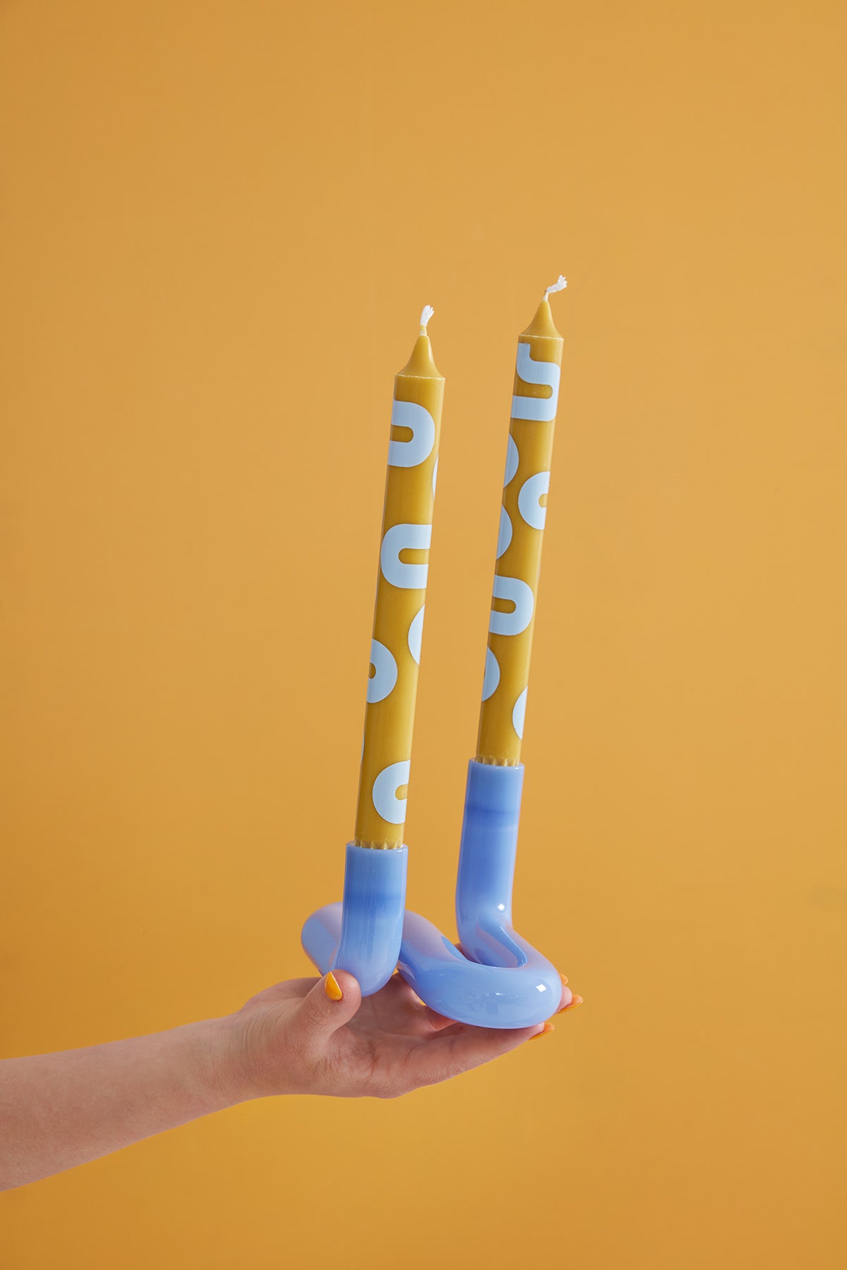 Vores WAVE lysestage giver plads til 2 stearinlys, hvor man enten kan bruge de klassiske hvide kronelys, eller give noget kontrast og bruge vores lys med en masse forskellige farver og print. Vi har både lys i farverne yellow/blue men også i farverne ochre/rose.