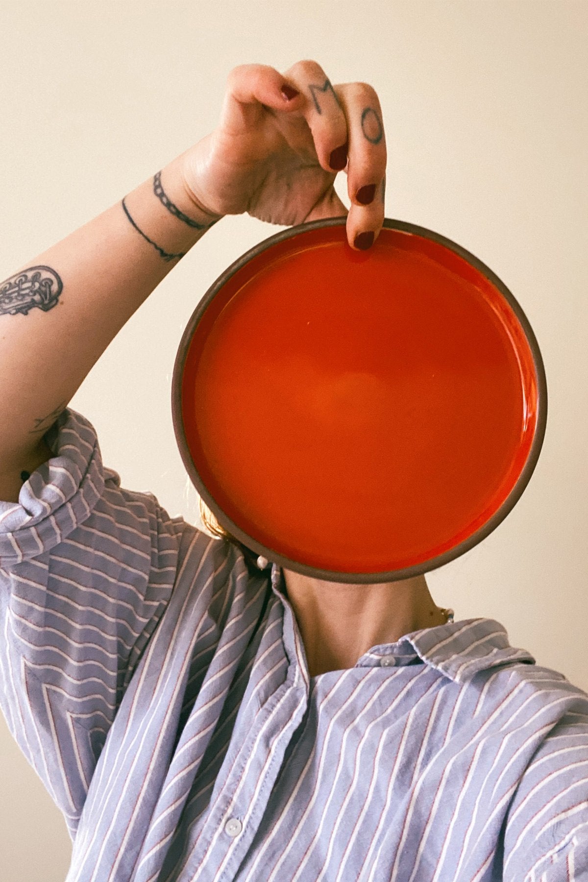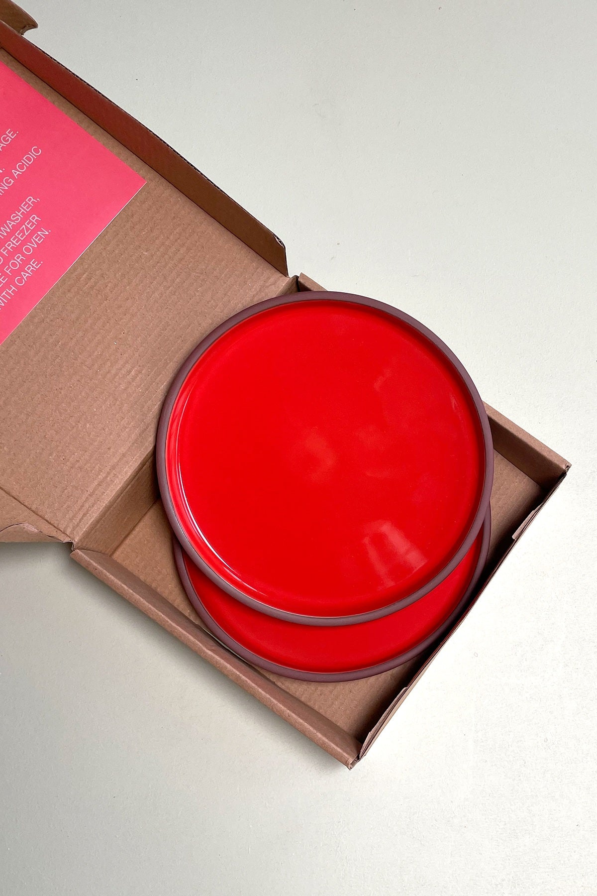 Tallerkenens farvekombination giver et flot og frækt udtryk med den mørkebrune terracotta og postkasserøde farve. Det giver et råt og retro udtryk, som vil oplive enhver borddækning og gøre denne festlig og spændende at se på. Du kan også lægge en papirblomst på tallerkenen eller kombinere tallerkenen med andet farvet keramik og farvet glas for den ultimative festlige stemning. Tallerkenen er eksempelvis smuk med vores lyserøde vinglas fra GLASSWARE serien.