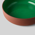 Serveringsskålen i terracotta/green er lavet af ler, og er delvis glaseret. Skålen har en rå ydreside i det smukke terracotta ler, og på sin inderside har den en stilet grøn glasur. Keramikskålen er stor, og har en høj kant, som gør at den kan indeholde mere.