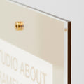 FRAMELESS kollektionen fra Studio About er en serie af transparente billedrammer i akryl. Rammen består af en transparent forside og en svagt farvet transparent bagside i ravfarve. To gyldne chicago skruer holder rammen sammen, og gør det nemt at skifte motivet. Billedrammen hænges let op direkte i den øverste skrue, alternativt kan man sætte en fiskesnøre i.
