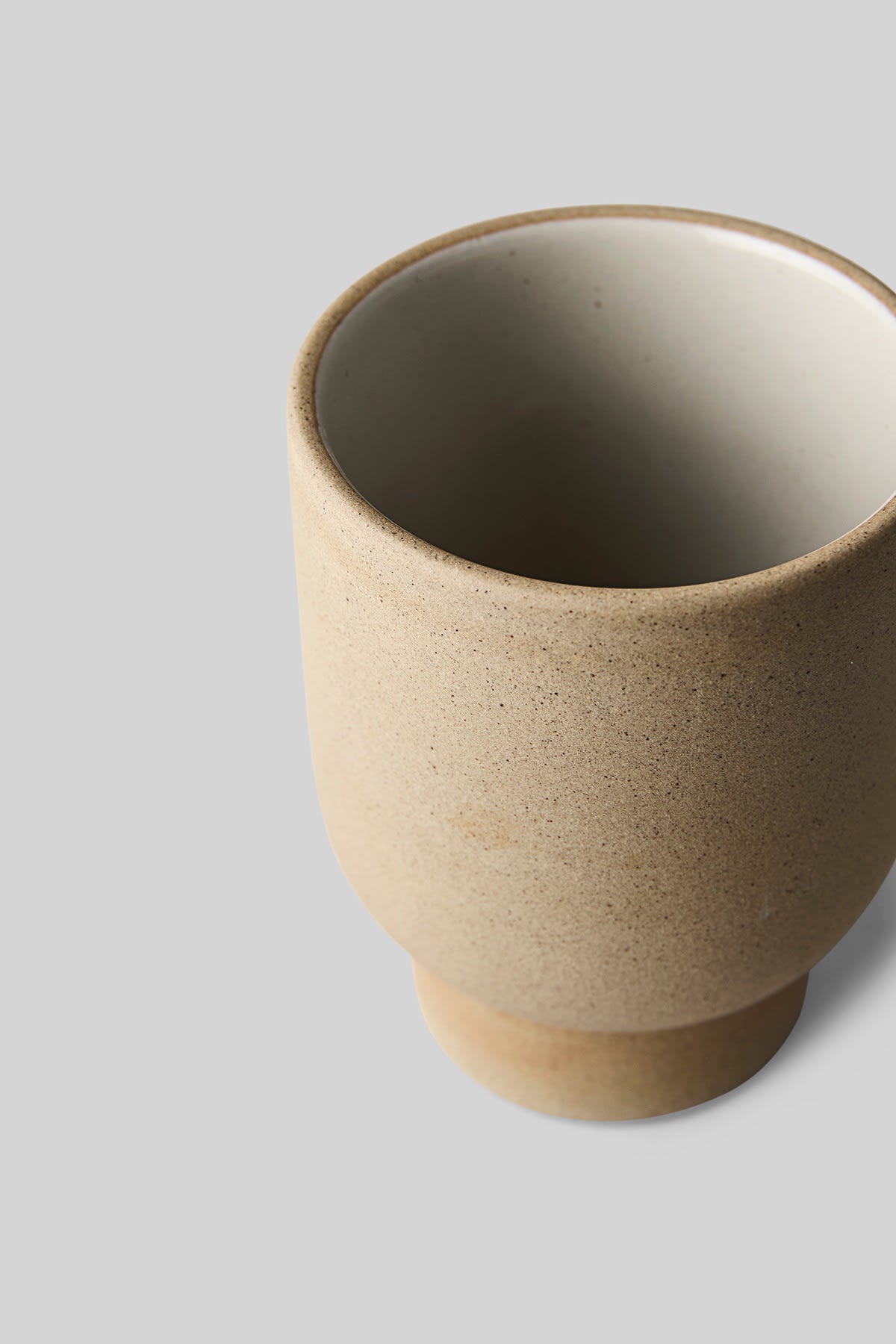 Koppen har et simpelt og elegant design med en glat overflade og en indsnævret fod. Dette er med til at give koppen et let og luftigt udtryk. Det sandfarvede ydre og det grå indre af koppen giver en smuk og stilren farvekombination, der tager sig elegant ud i et klassisk og minimalistisk hjem. Du kan også style koppen med kraftige farver; bland eksempelvis koppen med andre dele af vores CLAYWARE spisestel i de andre farver for at skabe en livlig og farverig borddækning.
