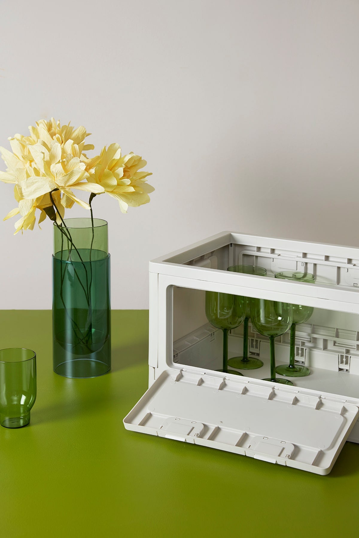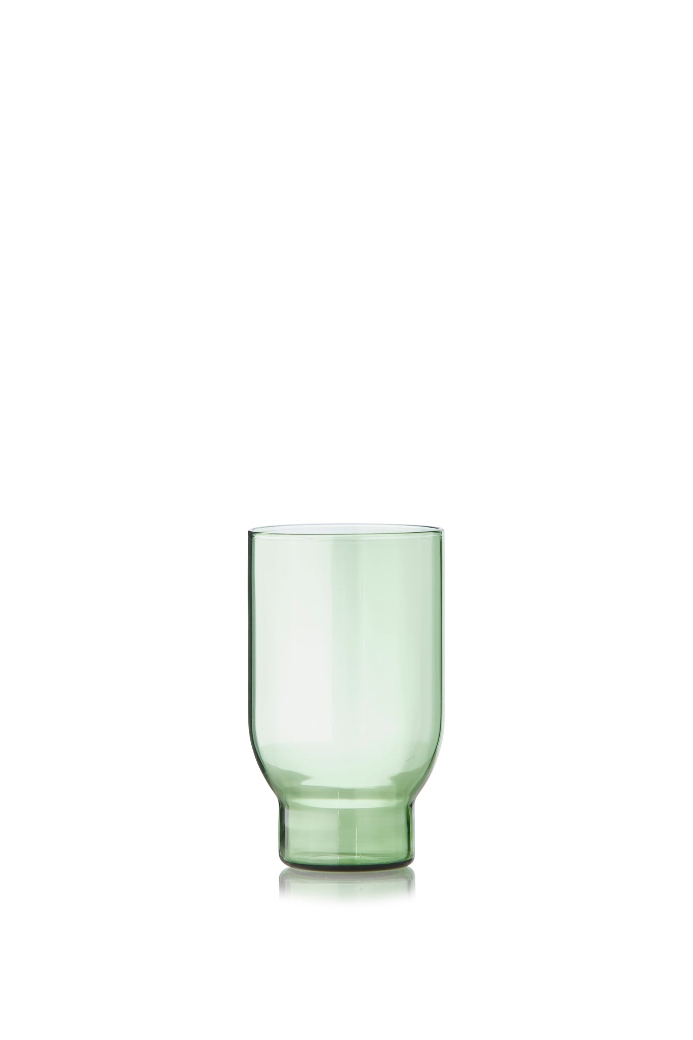 Vandglasset har en glat overflade med en indsnævret fod, der giver den et let og elegant udtryk. Den flaskegrønne farve gør, at drikkeglasset er smuk for sig selv som et pop of colour, men er også dekorativt blandet med andet farvet glas. Farvet glas giver en særlig stemning, og med drikkeglasset er det en nem måde, at få farve ind i dit hjem. Du kan med fordel dække dit bord med drikkeglasset i flere forskellige farver for at skabe en personlig og kreativ borddækning.