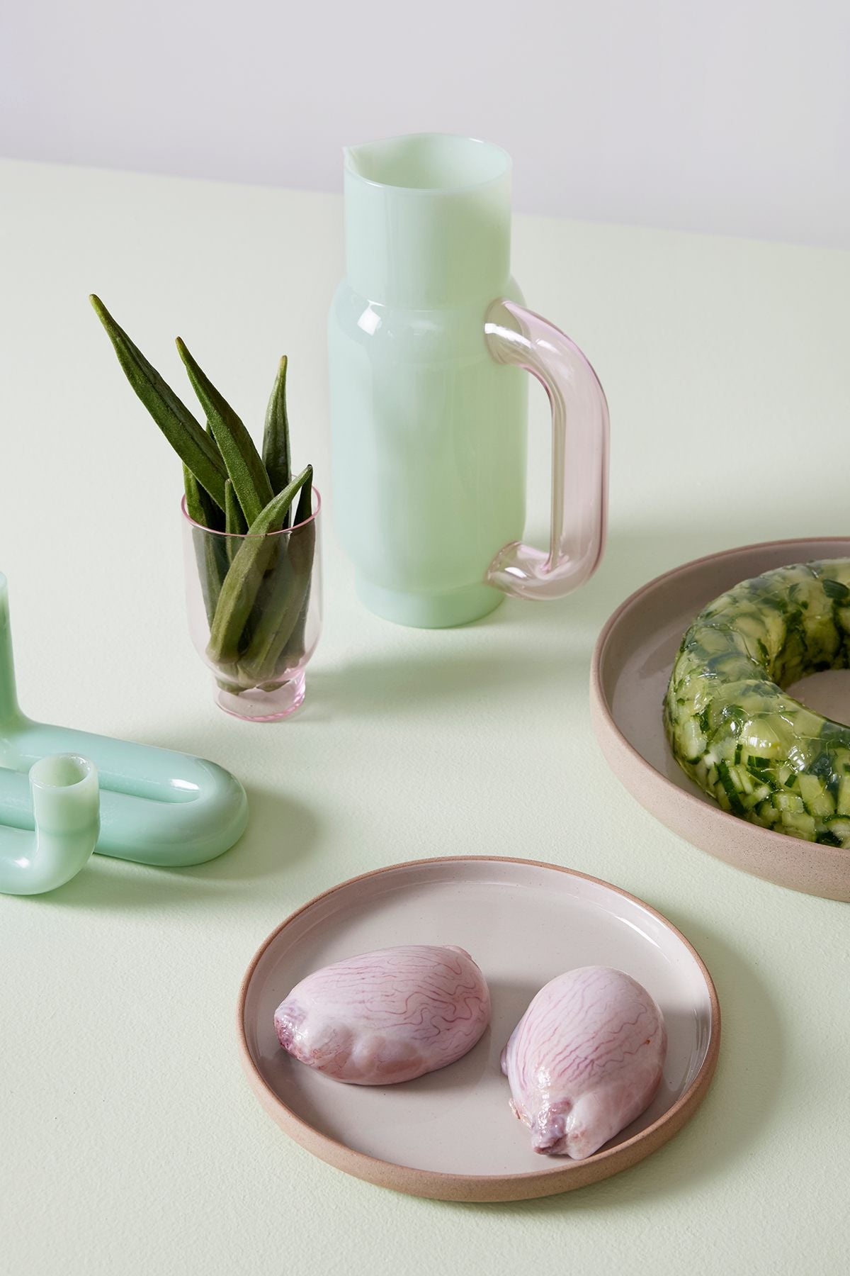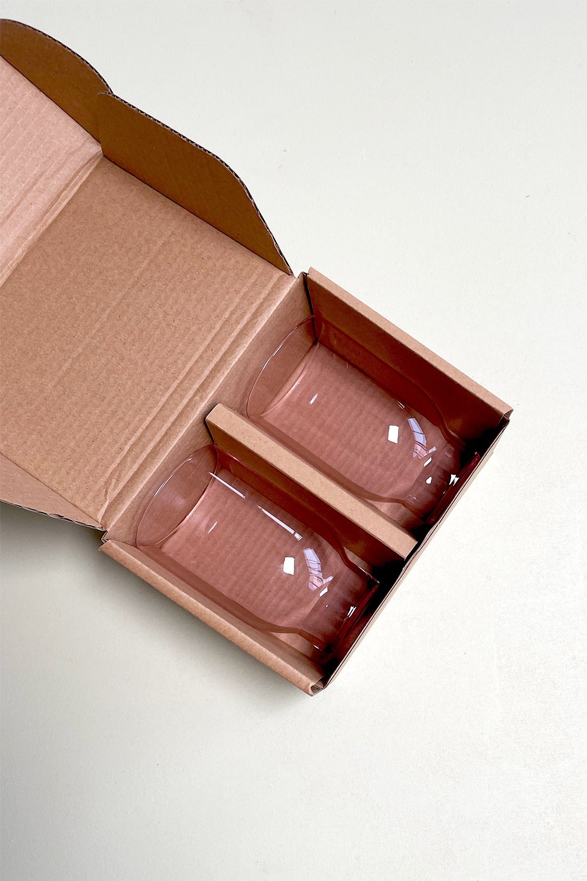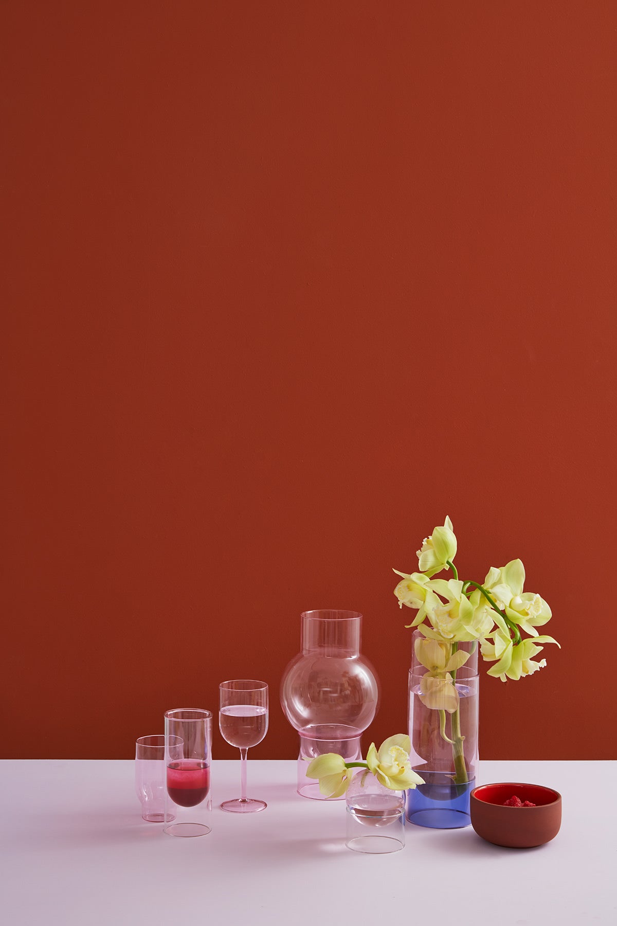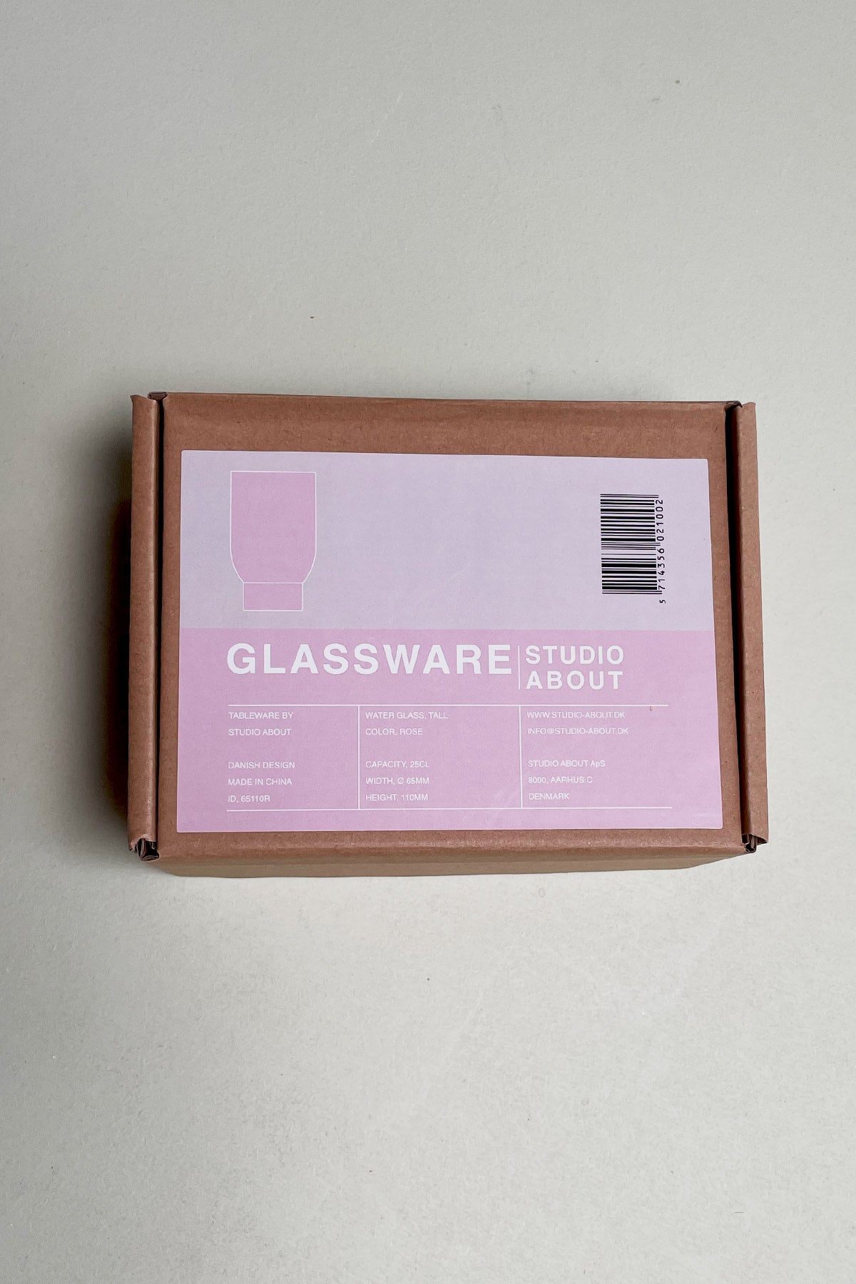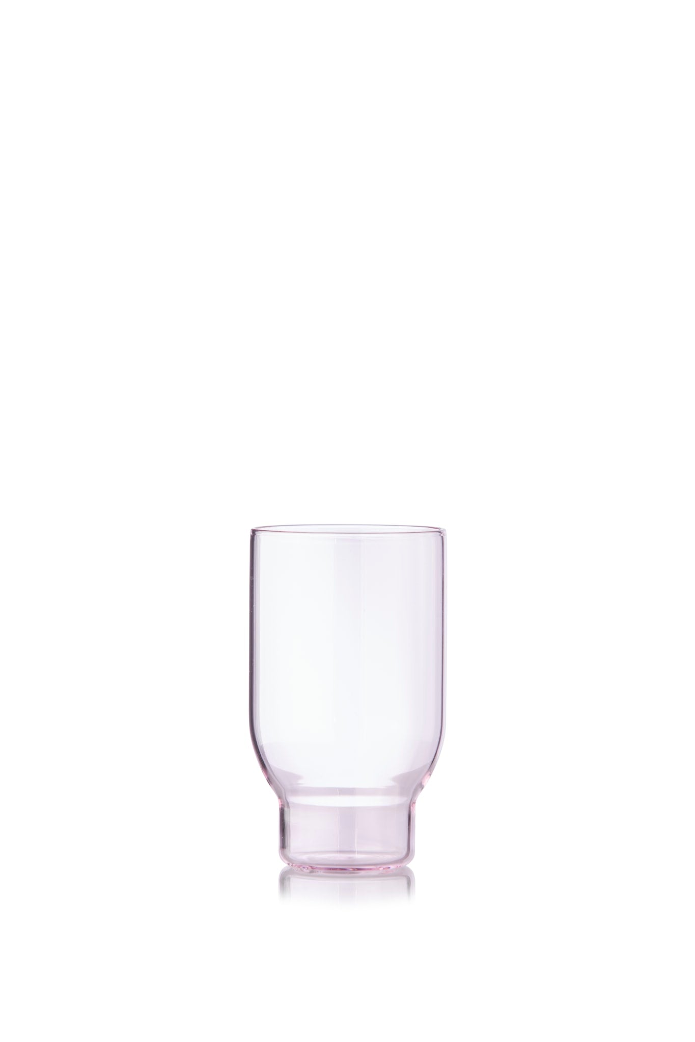 TABLEWARE er en ny kollektion som består af en serie af keramikstel, drikkeglas og vinglas i farvet glas, skabt og designet af arkitekt Mikkel Lang Mikkelsen. Dette vandglas er i farven rose og har en indsnævret fod som giver den et organisk udtryk. Vandglasset fås i et sæt med 2 stk og er perfekt til både vand, kaffe og boblevand.