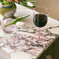 Glasset kan bruges både som hvidvin- og rødvinsglas, men er også perfekt til drinks, lemonader eller boblevand. Du kan sætte bær eller citronskiver i kanten, som vil stå smukt frem mod det rosefarvede glas, og gøre vinglasset endnu festligere at se på.