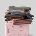Kollektionen består af flere farvekombinationer og vævemønstre, der kan mikses og matches for et personligt og farverigt udtryk.