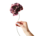 Denne blomst er lavet af gennemfarvet crepepapir og monteret på en lang, bøjelig grøn stilk. Stilken kan du let forme, så du kan få den form og længde du ønsker. Denne variant er i farven aubergine men fåes også i blå, grå og nude.